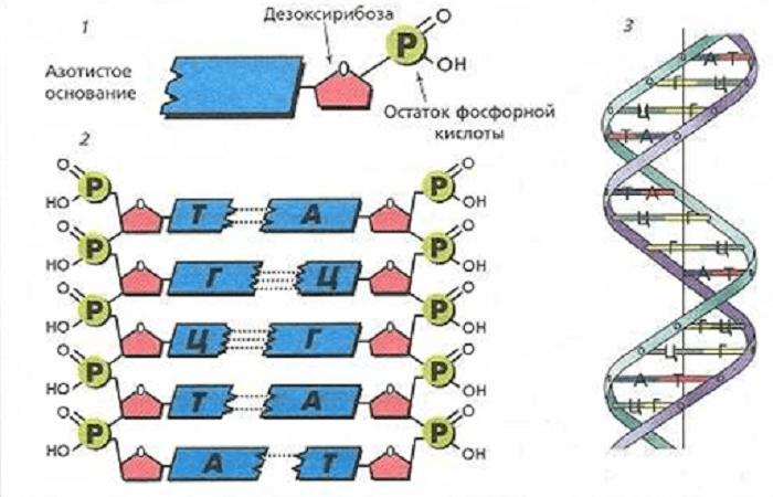 ДНК включает дезоксирибозу и азотистые основания – тимин, цитозин, аденин и гуанин. В структуру молекулы обычно входит 2 полинуклеотидных цепи, которые направлены антипараллельно. РНК состоит из рибозы и азотистых оснований – гуанина, аденина, цитозина, урацила. По структуре полинуклеотидной цепочки молекула совпадает с ДНК.