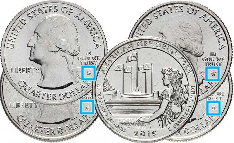 В настоящее время североамериканские монеты чеканят четыре отделения Монетного двора США, расположенные в различных городах. Они используют обозначение в виде одиночной литеры: P – Филадельфия, D – Денвер, S – Сан-Франциско и W – Вест-Пойнт. У каждого отделения своя специализация. Например, в Сан-Франциско чеканят годовые наборы монет США, а Вест-Пойнт производит коллекционные и инвестиционные монеты из золота, серебра и платины. Но иногда все четыре двора привлекают для совместной чеканки. В качестве примера упомянем монеты 2019 года из серии «Прекрасная Америка» («Парки»). Здесь буква, обозначающая монетный двор на лицевой стороне, расположена за портретом Джорджа Вашингтона. На фоне многомиллионных тиражей Денвера и Филадельфии выпуски Вест-Пойнта и Сан-Франциско крайне скромны. Поэтому монеты с буквами «S» и «W», ценятся дороже, чем «P» и «D».