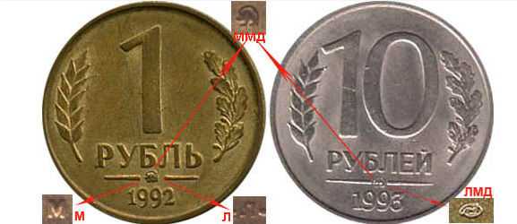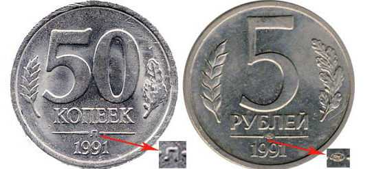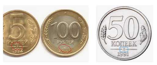 - Если монеты были выпущены в начале девяностых годов XX века, то соответствующие буквы о принадлежности следует искать на лицевой стороне.
