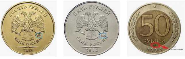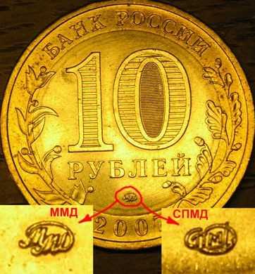 Если посмотреть на аверс монеты номиналом 10, 5, 2 и 1 рубль, то под левой лапой орла будет знак СПМД или ММД.