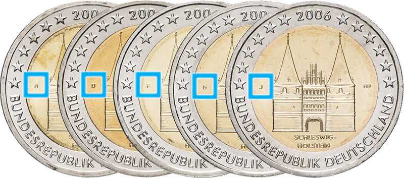 Раньше на немецких землях работало множество монетных дворов, но сейчас их число сократилось до пяти. Знак двора также проставляется одиночной литерой: A – Берлин, D – Мюнхен, F – Штутгарт, G – Карлсруэ и J – Гамбург. Поэтому коллекционерам полного набора евромонет приходится приобретать немецкие монеты в пяти экземплярах. В большинстве случаев тиражи каждой позиции для всех дворов схожи. Однако иногда несколько дворов заняты массовой чеканкой определённой монеты, а оставшиеся выпускают её лишь в составе годовых наборов (в этом случае малотиражные монеты стоят дороже отчеканенных в большом количестве). Поэтому для разных монет буква может как сильно влиять на стоимость, так и не быть решающим фактором цены.