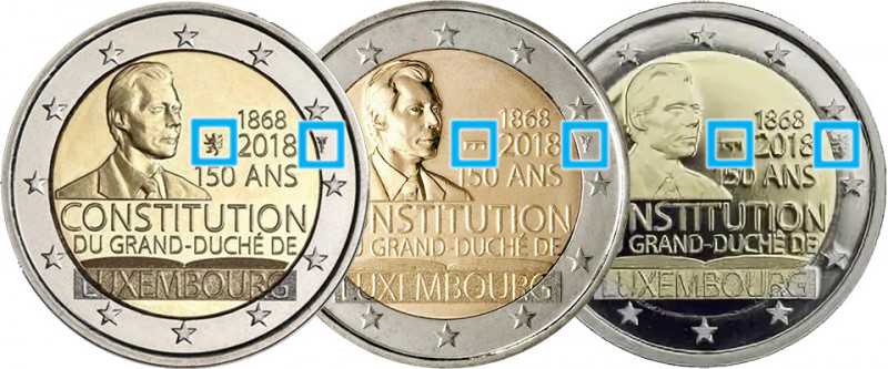 В заключение несколько слов о монетах Люксембурга. На них проставляется не только клеймо монетного двора, но и знак ответственного лица. Поэтому на одной и той же монете комбинация знаков может быть разной в зависимости от качества чеканки. Например, на 2 евро 2018 «150-летие Конституции Люксембурга» качества UNC (для обращения) ставят геральдического льва и посох Меркурия. Та же монета в улучшенном чекане для коллекционеров BU имеет на аверсе мост и посох. А на монетах «пруф» отчеканены лев и мост.