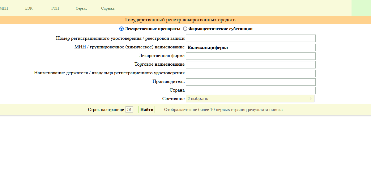 В поле поиска «группировочное (химическое) наименование» введите «колекальциферол» и нажмите кнопку «найти»: