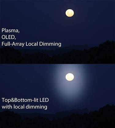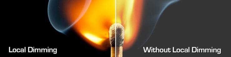 Некоторые светодиодные телевизоры имеют функцию локального затемнения как средство компенсации ограниченной контрастности и сероватого черного цвета. Эта функция в основном затемняет часть экрана, которая должна быть темнее.