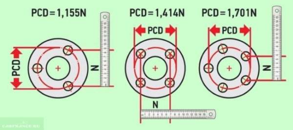 - PCD 4х100 — четыре отверстия, центра которых расположены по диаметру 100 мм.