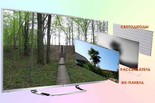 и равномерно распределяется благодаря специальной рассеивающей пленке. В зависимости от диагонали, светодиоды могут быть установлены как на одной стороне, так и на двух. В моделях с большой диагональю подсветка может быть установлена по всему периметру.