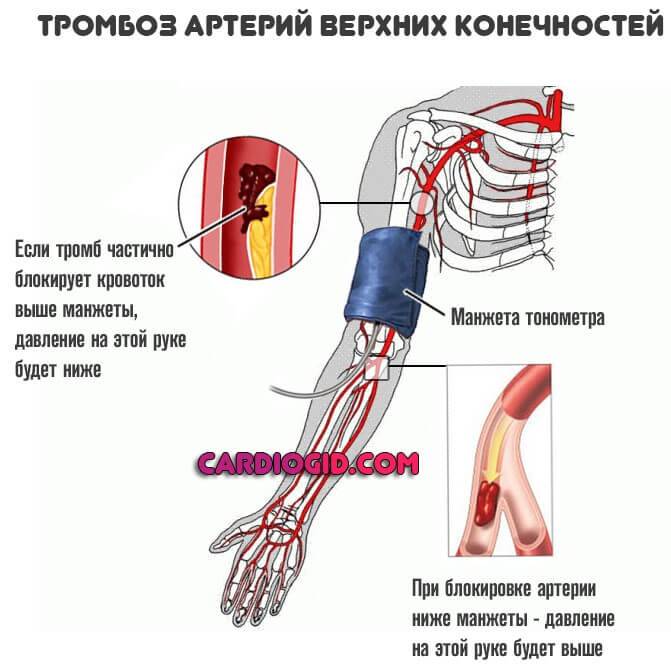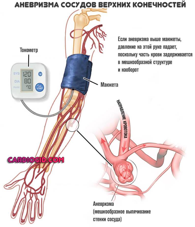 Если образование находится выше манжеты, то давление на этой руке будет ниже, чем на другой и наоборот.