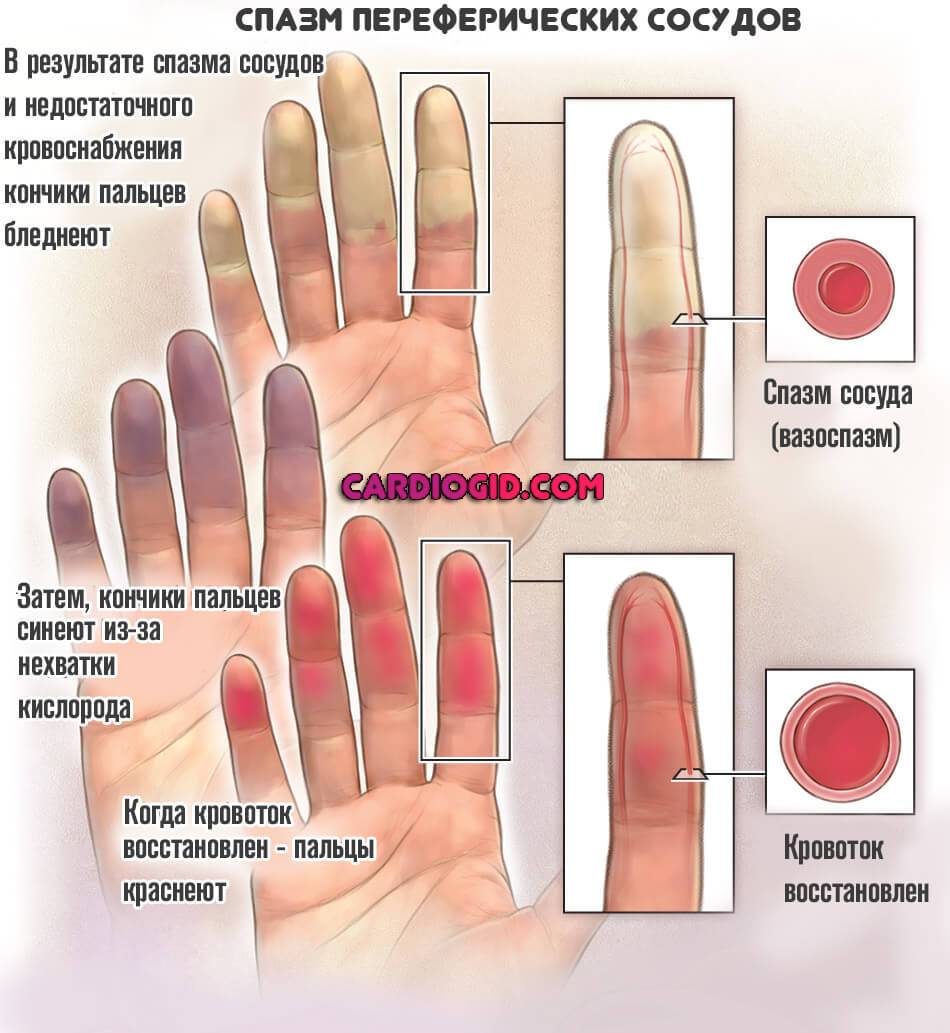 - кончики пальцев становятся холодными, вплоть до появления синюшности.