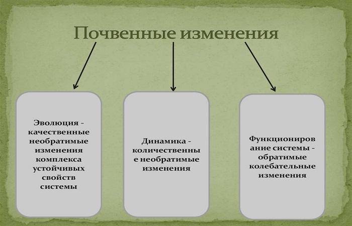 Это изменения уже сформированных, зрелых почв под влиянием эволюции окружающей среды. Так появляются новые типы или подтипы почвы. Эволюция происходит в результате саморазвития грунтов, накопления в них изменений в составе и структуре, включает в себя следующие циклы: