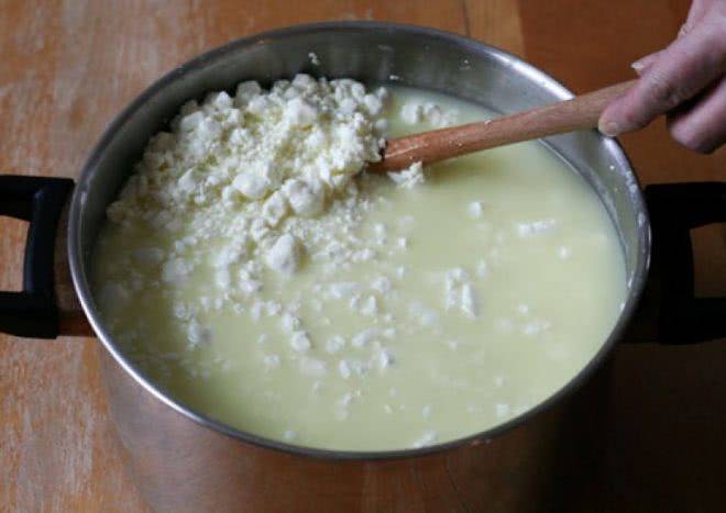 - Оставьте на минимальном нагреве до того момента, пока не начнут формироваться крупные зерна творога.