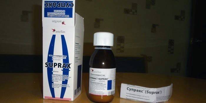 - Супракс – цефалоспорин от заболеваний дыхательных путей, фарингита, бронхита, тонзиллита, цистита, отита. Готовая суспензия дается ребенку по 2,5-10 мл 1-2 раза в сутки 7-10 дней. Для детей старше полугода.