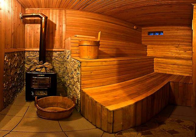 При этом внутри дома можно установить небольшой бассейн или купель, а снаружи (для зимних забав) — поставить чан или бочку для погружения, недалеко от выхода из дома.