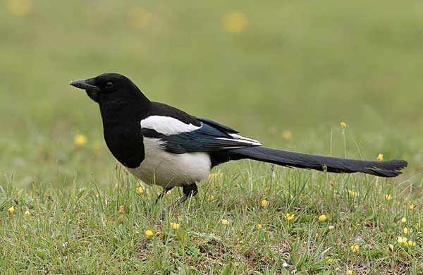 Вес сороки составляет 200-230 грамм, длина тела взрослой особи 50-51 см. Она отличается от остальных собратьев цветом оперения. Крылья, хвост, спина и голова птицы имеют черный цвет. А вот бока, концы крыльев и брюшко окрашены в контрастный белый.