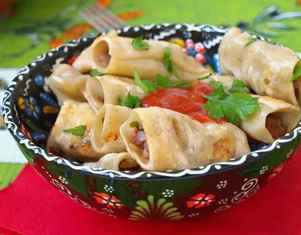 ». В дальнейшем, при распространении его на землях Азии, его стали дополнять различными начинками (мясо, тыква, лук, бараний жир, картофель). Поэтому рецептов этого блюда очень много и все зависит от специфики населения, которое его готовит.