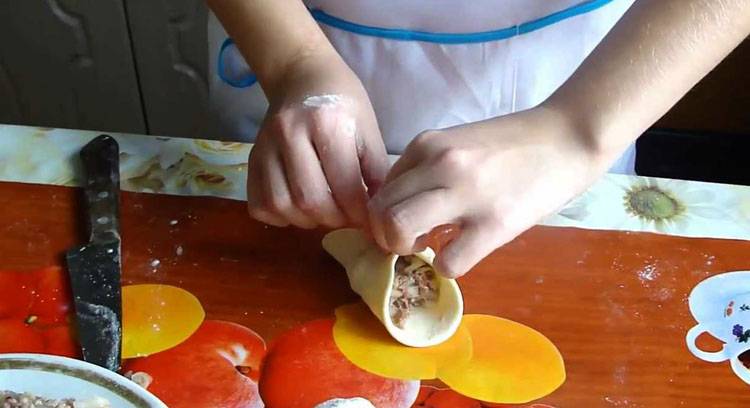 Тесто разделить на небольшие кусочки, из которых раскатываются плоские кружочки. На середину каждого кружка уложить немного фарша, приподнять края кружочка вверх и при помощи складок сформировать мешочек, верх которого закручивается вокруг своей оси и оканчивается небольшим хвостиком.