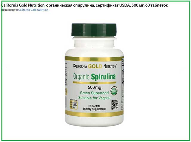 California Gold Nutrition, органическая спирулина, сертификат USDA, 500 мг ( есть упаковки с разным количеством таблеток). В порции — 3 таблетки, стоимость 1 порции — около 15 руб. Пьётся легко, особо нет ни привкуса, ни запаха.