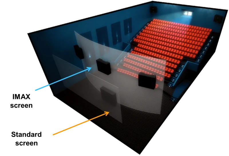 - В IMAX экран располагается на всю стену, в виде панорамы, немного изогнут и превышает размеры самого зрительного зала. Он гораздо шире, чем в обычном кинотеатре, во время просмотра не видно ничего, кроме экрана. Благодаря этому картинка более яркая, вместительная, детальная и объемная. Кинозалы IMAX создаются по уникальным проектам, таким образом, чтобы рассадить посетителей как можно ближе и в идеальном положении по отношению к экрану, заботясь о том, чтобы картинка была наилучшего качества. Эффект от просмотра объемных фильмов усиливается, благодаря отсутствию слепых зон, создается ощущение погружения в сцену.
