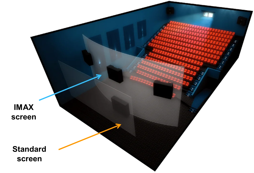 - В IMAX экран располагается на всю стену, в виде панорамы, немного изогнут и превышает размеры самого зрительного зала. Он гораздо шире, чем в обычном кинотеатре, во время просмотра не видно ничего, кроме экрана. Благодаря этому картинка более яркая, вместительная, детальная и объемная. Кинозалы IMAX создаются по уникальным проектам, таким образом, чтобы рассадить посетителей как можно ближе и в идеальном положении по отношению к экрану, заботясь о том, чтобы картинка была наилучшего качества. Эффект от просмотра объемных фильмов усиливается, благодаря отсутствию слепых зон, создается ощущение погружения в сцену.