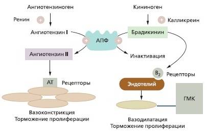 По цепи реакций ангиотензиноген, благодаря ренину, превращается в ангиотензин І; последний, при участии ангиотензинпревращающего фермента (АПФ), становится ангиотензином ІІ – самым мощным в организме человека вазоконстриктором. В результате этого каскада реакций увеличивается периферическое сопротивление, задерживается Na и вода в организме, повышается АД.