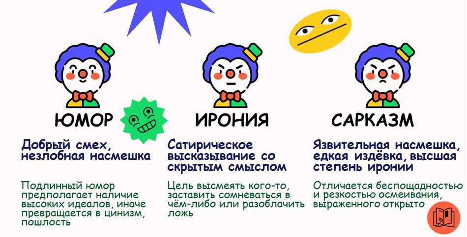 Ирония, с другой стороны, может использоваться с различными целями. Она может добавлять юмор и легкость в коммуникацию, особенно в неформальных обстановках. Иронические комментарии могут служить средством передачи смысла через противоположность слов или выражений. Однако, в отличие от сарказма, ирония не всегда носит отрицательный характер и не обязательно вызывает неприятные эмоции. Она может использоваться для создания иронической ситуации, показать противоречие или ироничное отношение к событиям или людям.