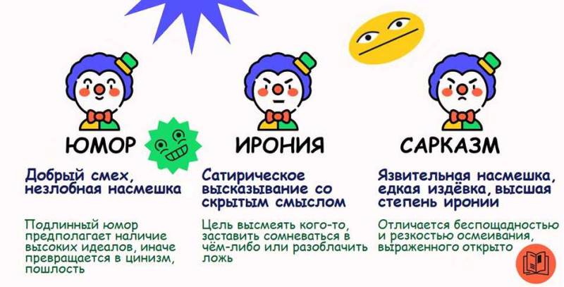 Сарказм, с другой стороны, является формой грубого иронического высказывания, имеющего целью высмеять, унизить или осмеять другого человека, группу или идею. Отличие между иронией и сарказмом заключается в том, что сарказм более явный и агрессивный в своем характере.