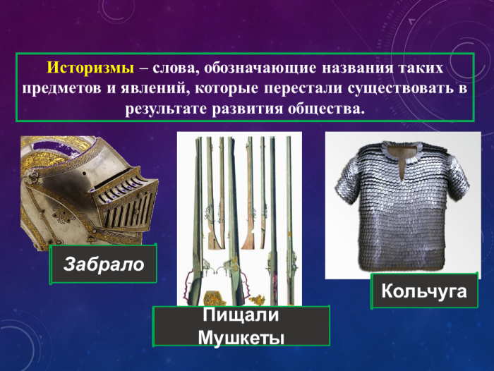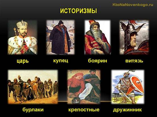 Для современного человека историзмы являются частью истории, их можно изучать для развития, но употреблять их в речи не нужно, окружающие не смогут понять их смысл. Возникнут недопонимания.Чтобы понимать историзмы, рассмотрим наглядные примеры слов.