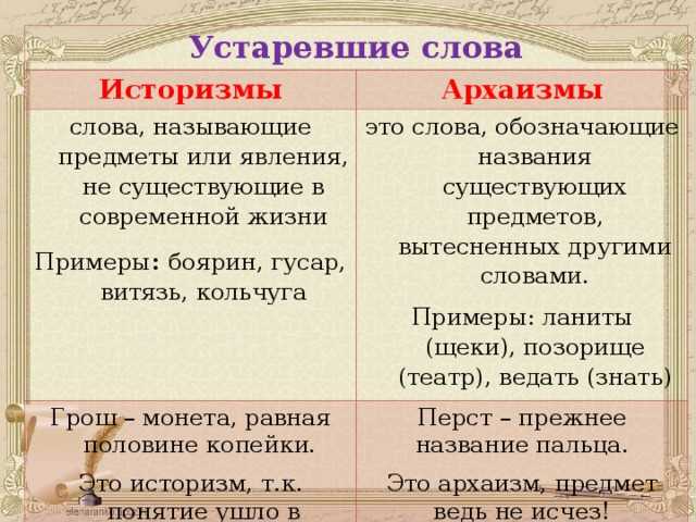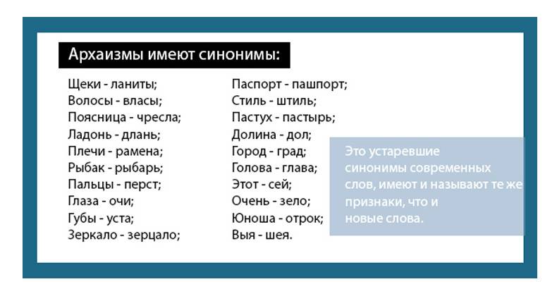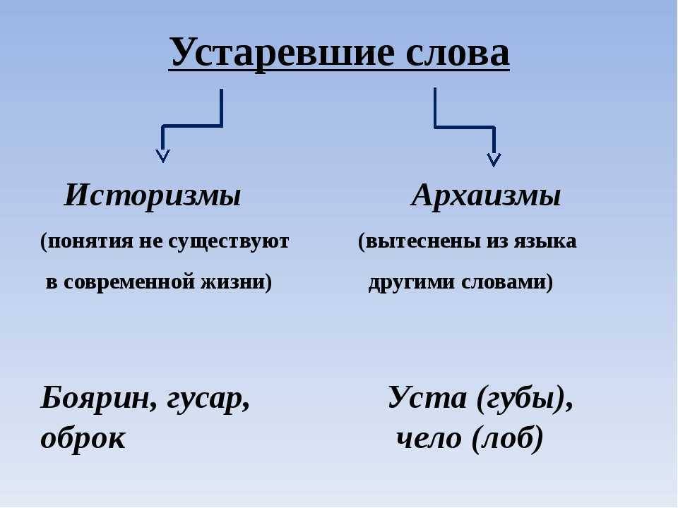 Архаизмы отличаются от историзмов тем, что сохранились понятия, которые архаизмы словесно обозначали. Устаревшие слова ушли, но появились новые слова — синонимы, которые заменили уже пассивную лексику.