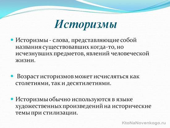 Историзмами называют слова, вышедшие из употребления в связи с тем, что предметы или явления, которые они обозначали, стали неактуальны для настоящего времени.