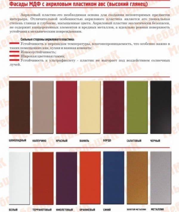 Самые надежные фасады из мдф – с нанесением пластика в алюминиевой рамочном фасаде. Тут о профиле мдф для рамочных фасадов. Существует богатый ассортимент цветовых решений – до 500.
