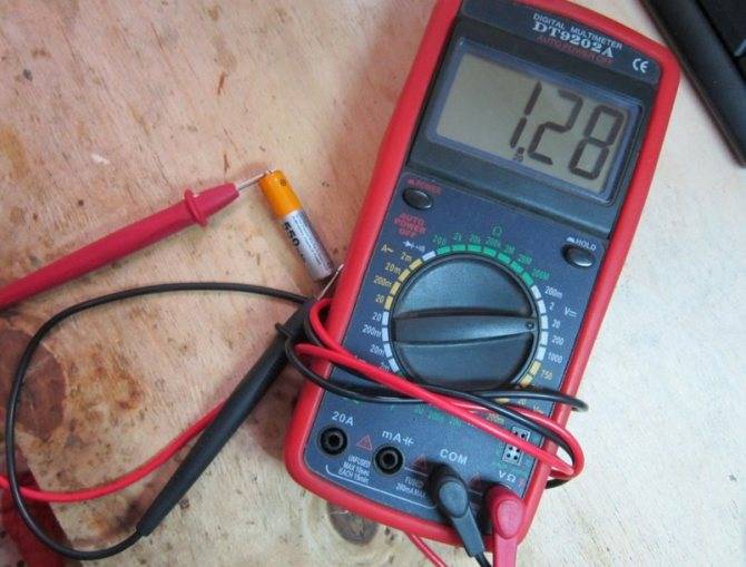 - Красным щупом касаются положительного полюса на несколько секунд, запоминая окончательное значение, которое покажет прибор.
