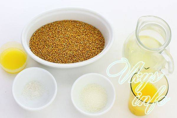 - По 4 больших ложки семян коричневой и желтой горчицы;