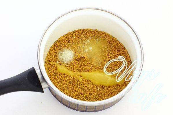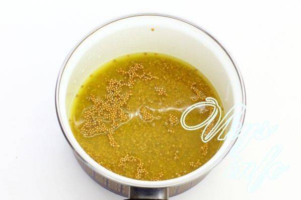 - Горчичные семена насыплем в стеклянную посуду, вольем уксус и вино. Накроем плотной пищевой пленкой и уберем постоять на сутки при температуре жилого помещения. Все составляющие должны «пропитаться» ароматами друг друга;