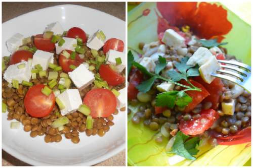 - В процессе варки чечевицы покрошим брынзу, разрежем томаты дольками, лук – на тонкие ломтики;