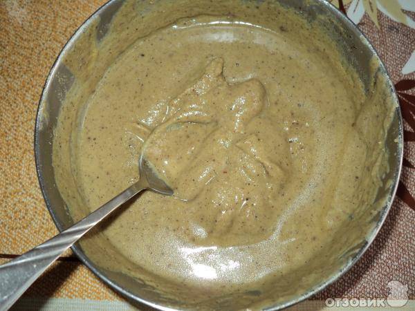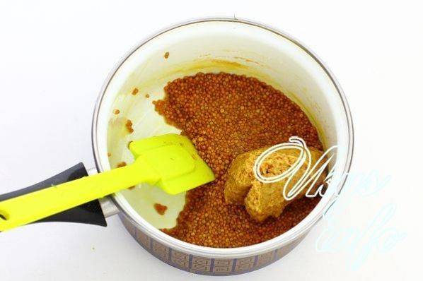- Смешиваем все ингредиенты. Если в посуде с горчичными семенами остались излишки воды, выльем их. Подбавим туда готовую основу и вкусные специи;