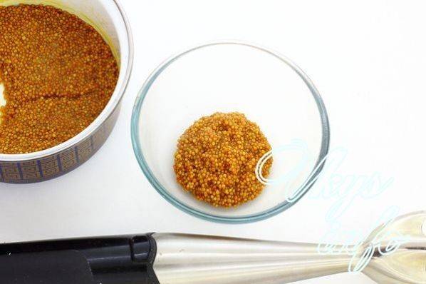 Для приготовления французской горчицы нам понадобятся горчичные семена. Они могут быть светлые и темные. Можно использовать оба варианта, так даже красивей. У меня оказались светлые зернышки. Их нужно промыть и замочить в уксусе. Оставляем семена в таком виде в холодильнике на пару дней.