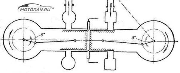 «П-образная» продувка.Принцип «П-образной» заключается в применении только на моторах с двумя цилиндрами. При проведении, один цилиндр участвует в процессе впуска газов, второй выпускает отработку. Эффект продувки ощущается в топливной экономичности, процесс сопровождается неравномерным нагревом пары, отвечающей за выпуск.
