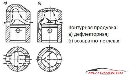 «Контурная» продувка.Вид продувки прост и поэтому распространён. Недостаток то, что применение связано с перерасходом топлива. Разновидности контурной продувки: возвратно-петлевая, дефлекторная, высотная.