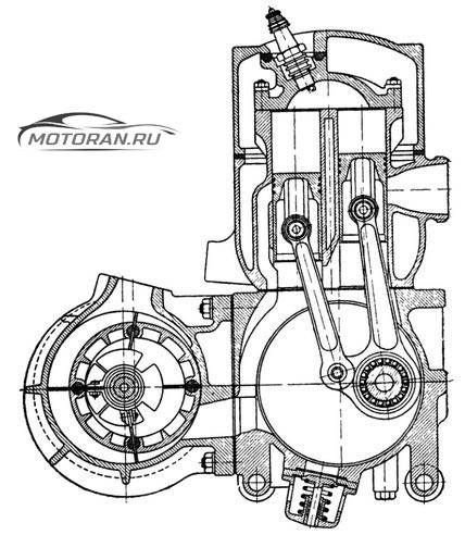 процесс наполнения цилиндра свежей горючей смесью, сжатия ее, воспламенения, рабочего хода (когда энергия сгорания с силой движет поршень вниз, вращая коленчатый вал) и выпуска выхлопных газов происходит за два такта.