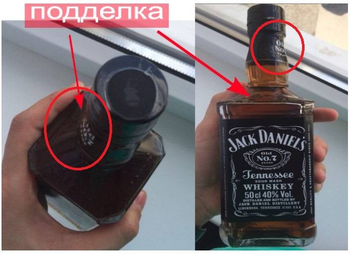 К сожалению, иногда форма бутылки и надписи на этикетках соответствуют знаку качества, но напиток оказывается фальсификатом с отвратительным вкусом. Это происходит из-за того, что подпольные производители различными путями собирают оригинальные емкости и разливают в них низкокачественную продукцию. Но, несмотря на то, что мошенникам удается раздобыть бутылки из-под настоящего Jack Daniel’s или сделать их максимально похожими на оригинальные, подделать крышки и пленочные покрытия у них не получается.