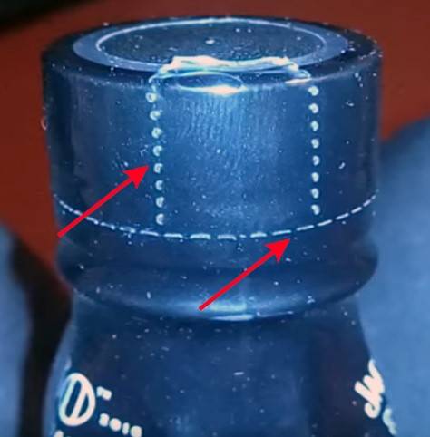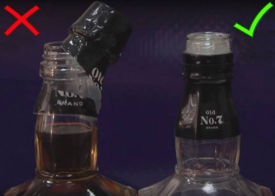 Разница между настоящей и поддельной оберткой на горлышке заключается в оформлении и качестве материала. Оригинальная пленка максимально разглажена, на передней части нанесена надпись Old No.7 brand, сзади – Tennessee WHISKEY, нанесена заводская перфорация в виде двух вертикальных и одной горизонтальной полос. На бутылке с суррогатом пленка часто имеет мятый вид, надписи смещены или отсутствуют, перфорации нет.
