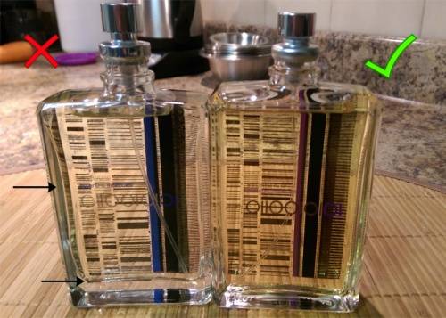 Полезный способ, как отличить фейк: посмотреть на флакон на просвет. Если есть заметный шов на стекле или неровности, то об оригинале речь не идет