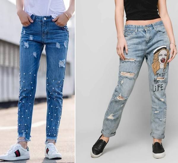 Если раньше общий стиль мужских джинсов отличался строгостью и лаконичностью, то сегодня границы стерты. Сегодня мужчины могут носить брюки с вышивкой, декором, рваными краями. На таких моделях используют самый разный декор: от пуговиц, наклеек до шипов, клепок и заплат. Для женских брюк характерен такой декор: кружево, бисер, вышивка, стразы. Помимо этого, при создании женских моделей могут использоваться несколько типов тканей. Например, сочетание кожи и денима, а также использование вставок из трикотажа или пряжи.