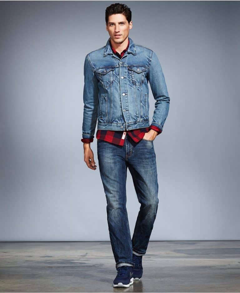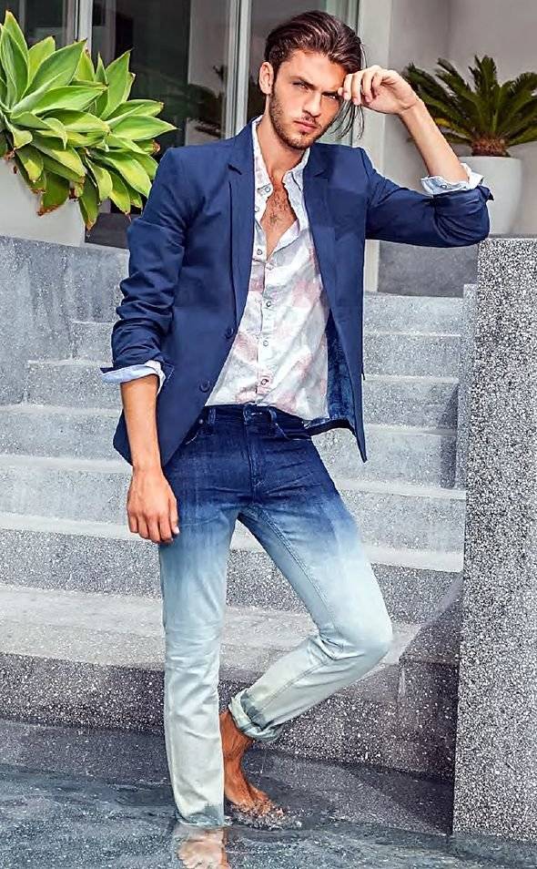 Мужской стиль более сдержанный. Сильная половина человечества предпочитает классические нейтральные цвета: голубой, синий, серый, индиго. Хотя среди моделей можно заметить зелёные или коричневые джинсы. И к тем, и к другим отлично подойдёт футболка, пуловер, пиджак или любая другая одежда.