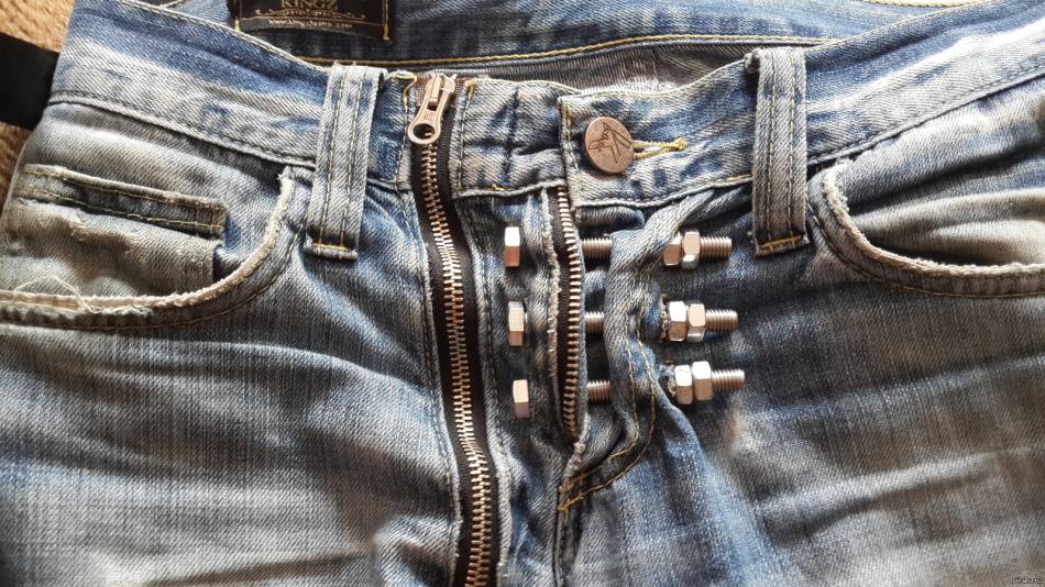 джинсов любят и девушки, и парни. Чтобы сделать свои брюки необычными, нужно просто запастись интересной фурнитурой или просто обычными вещами, которые всегда есть под рукой. На картинке выше видно, какие получились стильные джинсы, которые задекорированы обычными железными болтами.