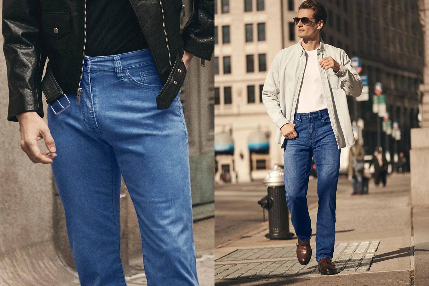 Для мужчин джинсы являются предметом базового гардероба, который можно носить с пиджаком и туфлями. Поэтому они сдержаннее, нейтральных оттенков, а потертости если и есть, то минимальные.