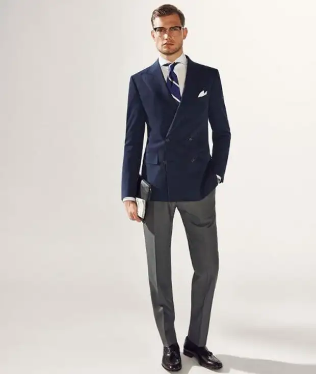 Деловой стиль предусматривает пиджак и брюки одного тона и фактуры . Однако, если хочется разнообразить комплект, лучше руководствоваться правилом – низ светлее верха. В этом случае можно отлично сочетать бежевые или серые штаны с синим пиджаком. Чёрные пиджаки можно сочетать практически с любым цветом брюк, а вот синие, бежевые или чёрные модели составят гармоничный ансамбль с коричневым пиджаком.