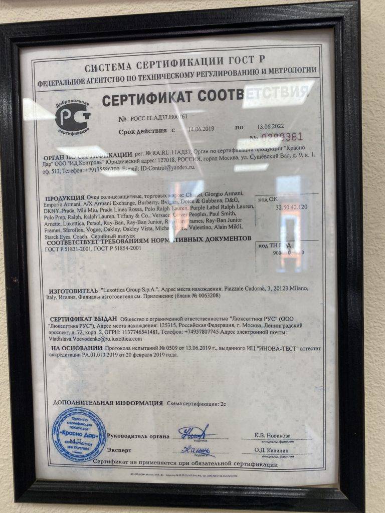 Также на стене магазина висят сертификаты сторонних организаций. Продавцы ссылаются на них, когда дело доходит до подлинности товаров, но они не могут объяснить, как их магазин связан с перечисленными там компаниями. Очевидно, этого адреса нет даже на сайте Ray Ban в разделе с точками продаж.