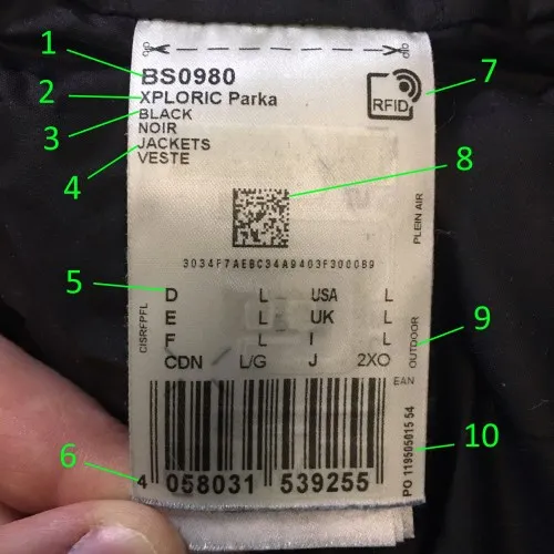 На верхней части бирки обычно указана страна-производитель и размер по различным стандартам. Однако нас больше всего интересует длинная цепочка цифр, расположенная в нижней части бирки.