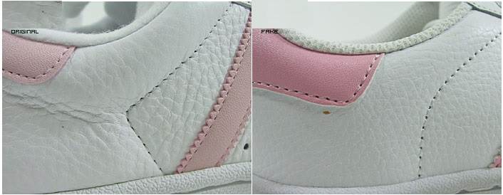 использует в своем производстве только высококачественные ткани и материалы. Не допускаются торчащие нитки, все должно быть очень ровно и аккуратно. В оригинальных изделиях не может быть подтеков клея или разводов. Подошва чаще всего прошита, а шов спрятан. На фото ниже слева оригинальные кроссовки, а справа подделка.