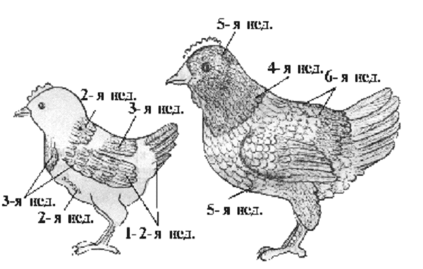 - в 3 недели от роду (21 день) у самок слой пуха на теле начинает меняться на оперение, самцам для обновления покрова требуется более долгий срок.